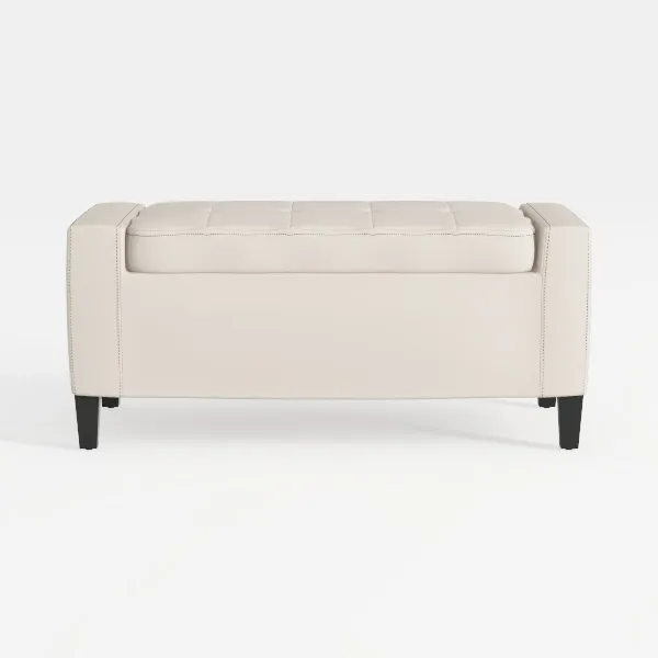 A 3D model of an Ottoman, featuring beige leather upholstery, tufted storage compartment, and black tapered legs, with a modern minimalist style. It has low-poly geometry and is suitable for home decor or living room use.