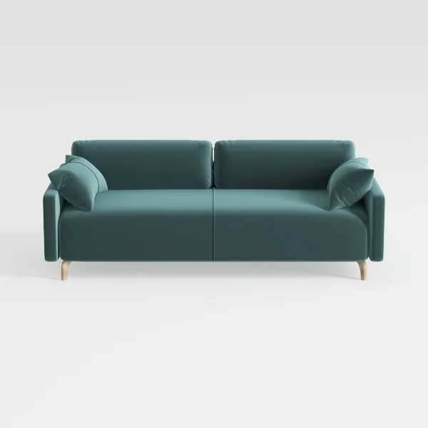 This sofa, with its soft teal upholstery and streamlined silhouette, draws design inspiration from the serene, muted tones of coastal environments, blending a sense of calm with contemporary minimalism. The velvety texture of its fabric feels surprisingly inviting, with a gentle sheen that catches light softly, while the color—reminiscent of polished sea glass—adds a subtle, sophisticated depth to any room. Clean, unadorned lines define its structure, from the wide, flat arms to the gently sloped back, creating an airy, uncluttered look that works equally well in compact apartments or spacious living areas.