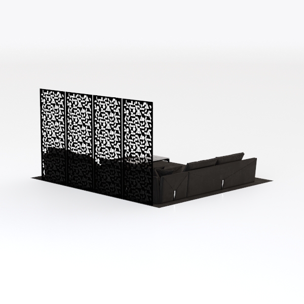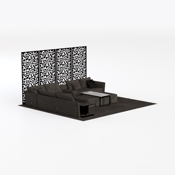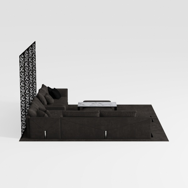The design takes cues from the interplay of architectural precision and tactile warmth, crafting a piece that feels both intentional and inviting. The sofa’s deep, warm gray upholstery boasts a sumptuously soft texture—velvety to the touch yet structured enough to maintain its shape—while the L-shaped silhouette, with its gently sloping armrests and subtle angular creases, adds quiet sophistication. The neutral palette, complemented by the intricate black-and-white geometric screen behind it, creates a monochromatic yet layered visual rhythm, drawing the eye to the thoughtful details without overwhelming the space.