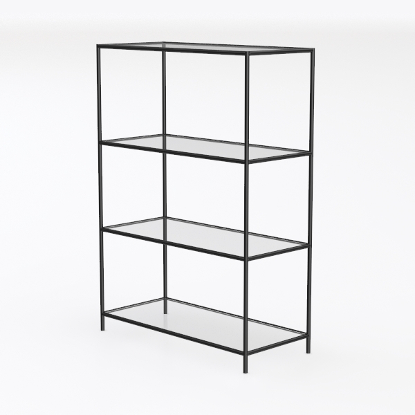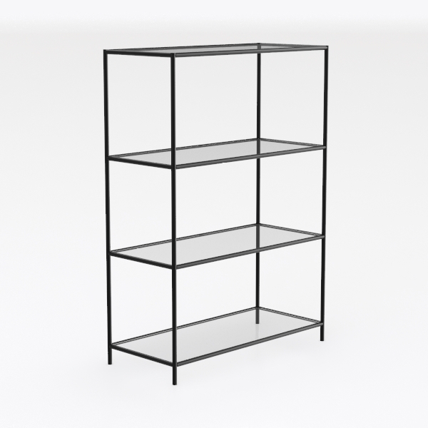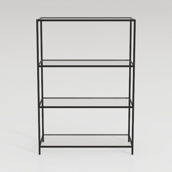 Design inspiration draws from minimalist industrial aesthetics, combining sleek black metal frame with clear glass shelves. Its clean lines and open structure create a light, airy visual. Perfect for modern apartments or home offices, pairing well with Scandinavian minimalism or industrial chic. Spacious shelves offer ample storage for books, plants, or decor, blending function and style seamlessly.