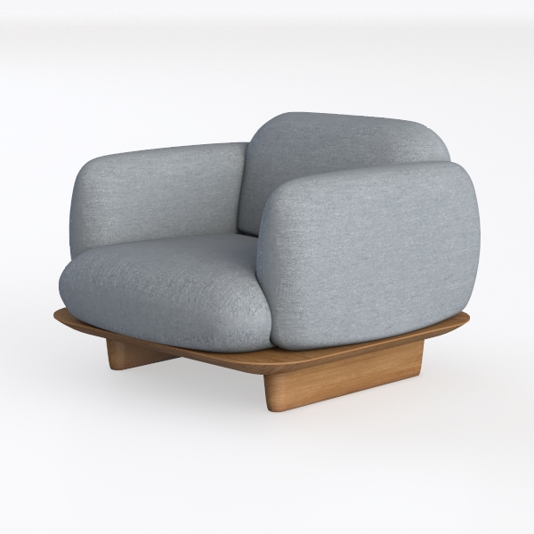 Crafted with a focus on organic comfort, this armchair takes cues from nature’s softest forms—think smooth, rounded river stones or the gentle curve of a cloud—resulting in a silhouette that feels both approachable and serene. The upholstery, a light blue fabric with a subtle textured weave, invites touch, offering a warm, tactile experience like sinking into a cozy embrace; it’s lightweight yet durable, promising long-lasting comfort. The frame, made from natural wood with a smooth, unvarnished finish, adds a grounded, earthy contrast, its warm grain complementing the chair’s soft, rounded shape.