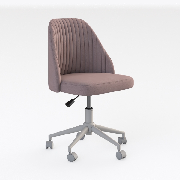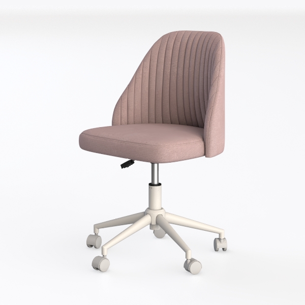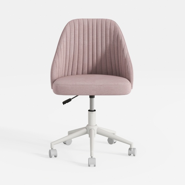Inspired by soft Scandinavian minimalism, its curved silhouette blends warmth and elegance. Blush-pink upholstery with subtle vertical ribs offers smooth, tactile comfort, while clean white legs and swivel wheels add light, airy charm. Adjustable height and silent casters make it ideal for home offices or cozy reading nooks, balancing style and practicality.