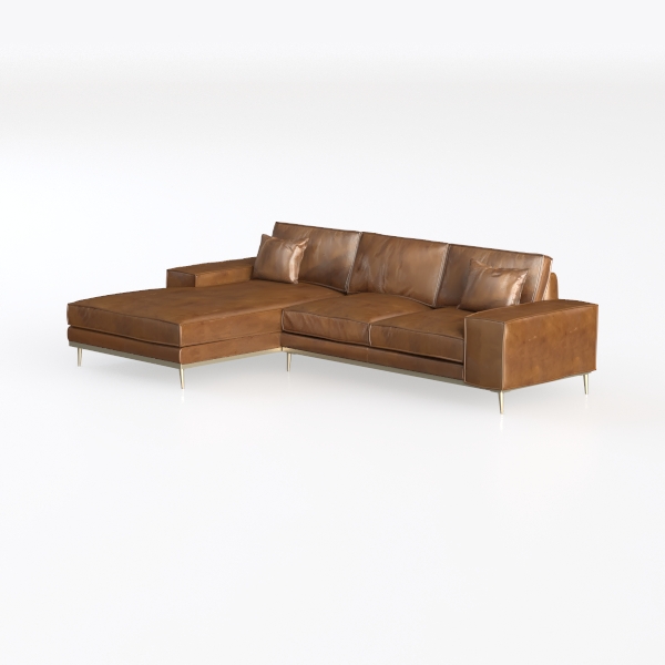 The star of the piece is its rich, buttery leather in a warm caramel-brown hue. The material’s visible grain catches light softly, creating depth, while its texture is surprisingly tactile: smooth to the touch yet subtly structured, it feels premium without being stiff, softening slightly with use to form a second skin of comfort. Sleek brass legs, thin and angular, lift the sofa from the floor, adding a touch of understated luxury and making the space feel lighter and more open.