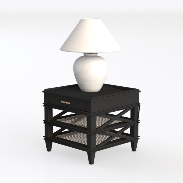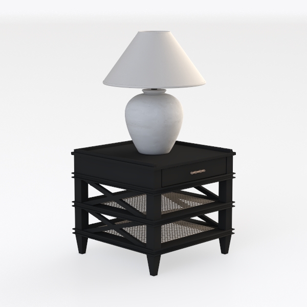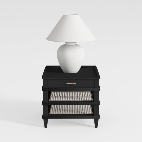 Inspired by retro craftsmanship and modern simplicity, this black nightstand features a sleek matte finish and intricate woven shelves. The smooth, cool surface contrasts beautifully with the soft white lamp above, creating a balanced, calming aesthetic. A deep drawer offers hidden storage, while open shelves display decor, blending functionality and style—ideal for minimalist or Scandinavian bedrooms.