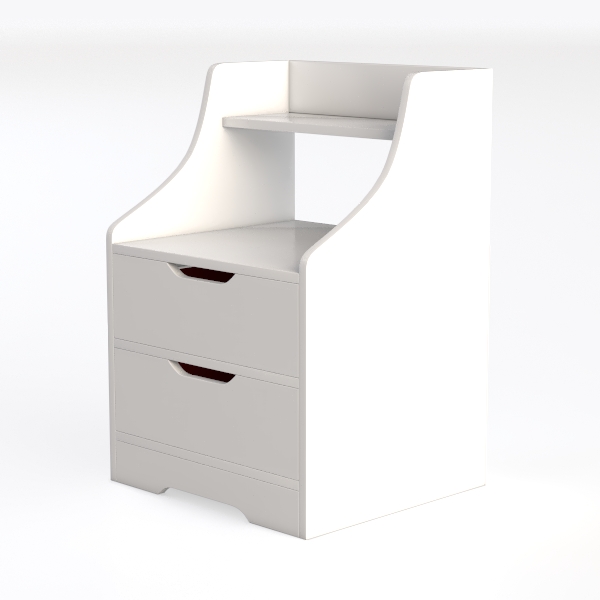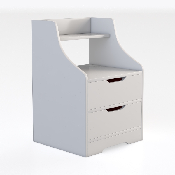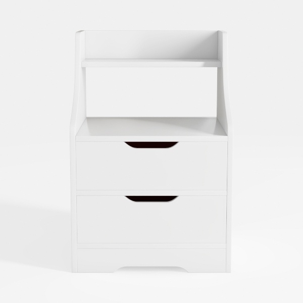 Inspired by minimalist aesthetics, this storage unit blends clean lines with practicality. Its smooth, matte white surface feels cool and refined, casting soft shadows that enhance its sleek silhouette. Perfect for a modern bedroom or study, it pairs beautifully with wooden accents and warm lighting. Two spacious drawers offer hidden storage, while the upper shelf displays small decor, balancing functionality and minimalist charm.