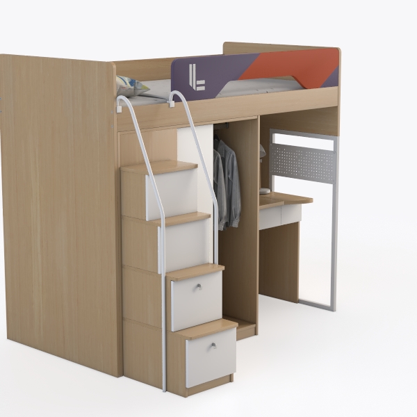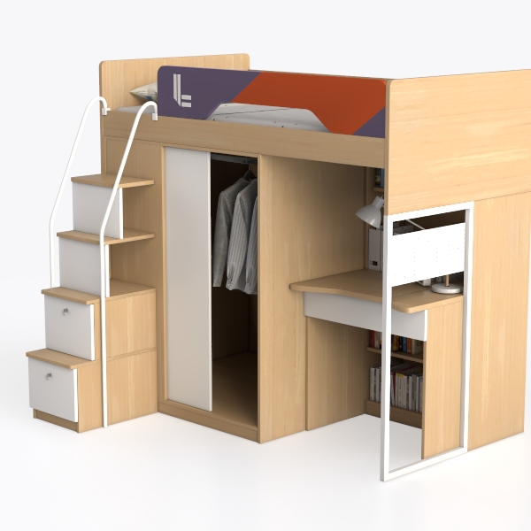 Designed for space-efficient living, this multifunctional piece blends sleep, storage, and study. Warm wood tones and vibrant geometric bedhead create a bright, inviting vibe, with smooth surfaces and clean lines enhancing its modern charm. Ideal for kids’ rooms or compact spaces, it pairs with minimalist decor and soft lighting, while the elevated bed, built-in wardrobes, drawers, and study nook offer ample storage and workspace.