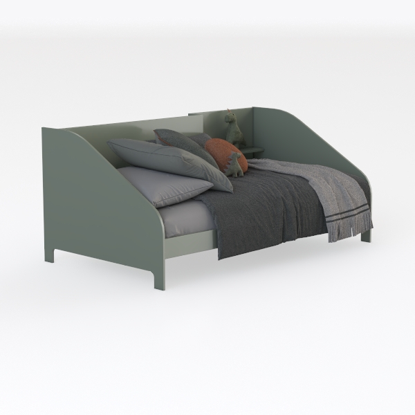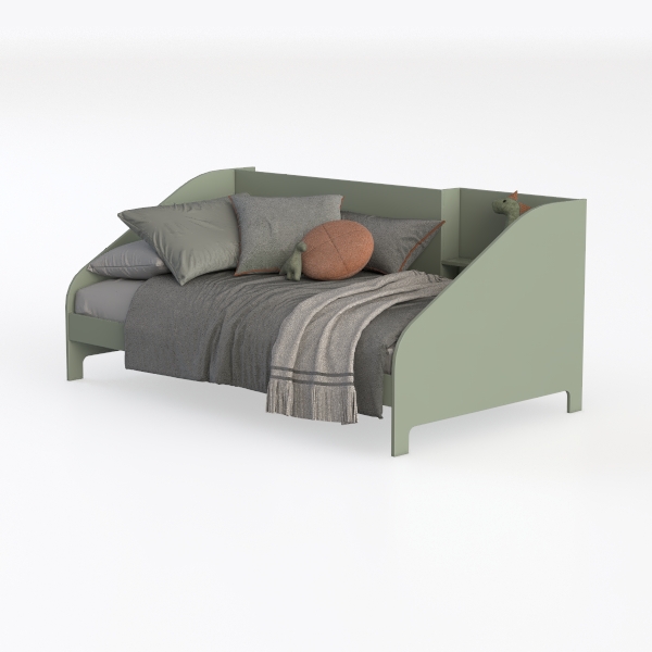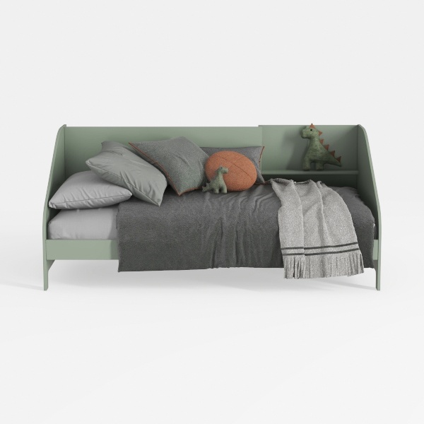 Inspired by soft, earthy tones, this bed boasts a gentle sage frame with a smooth, matte surface. Gray linen bedding adds warmth, while textured throws and playful dinosaur decor infuse charm. Ideal for a cozy kids' room or minimalist space, it pairs with wooden nightstands and pastel accents. Its low-profile design and plush pillows ensure ultimate comfort, making bedtime a delight.