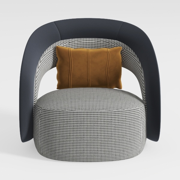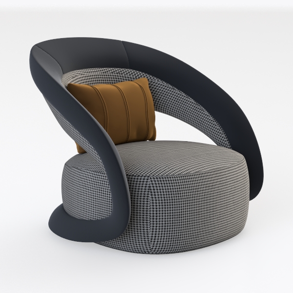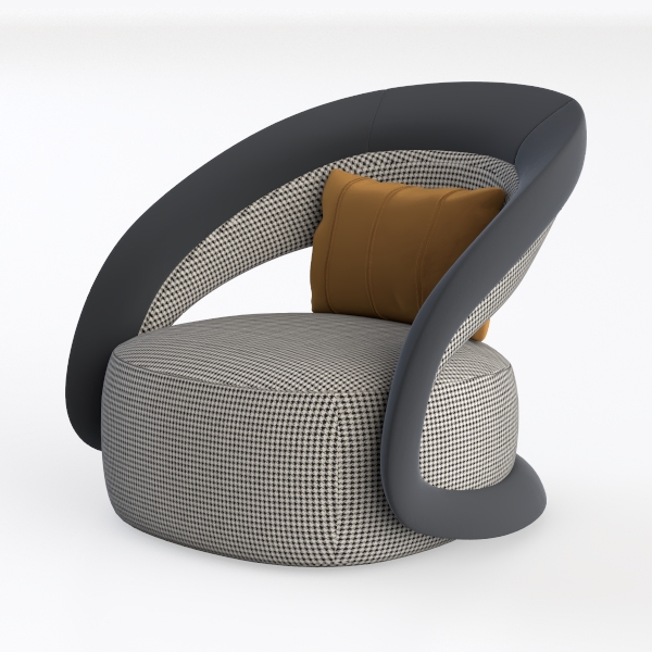Inspired by organic curves and modern minimalism, this armchair features soft, textured houndstooth upholstery with a deep, rounded seat. A warm brown velvet cushion adds visual contrast, while the curved back and wide base ensure exceptional comfort. Ideal for a contemporary living room, pairing beautifully with marble side tables and metallic floor lamps to enhance a modern-luxury vibe.