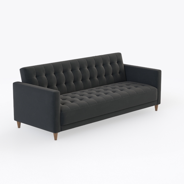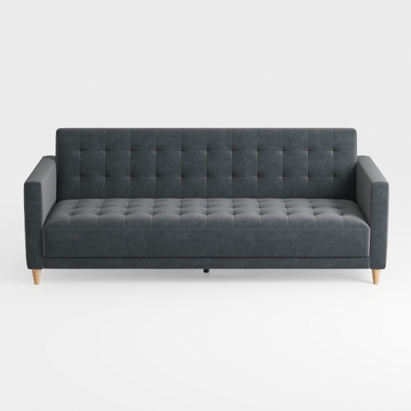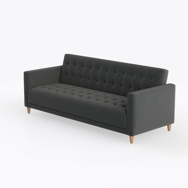 This sofa draws inspiration from mid-century modern design, blending clean geometric lines with timeless comfort to suit contemporary living spaces. Its plush, deep-gray upholstery features subtle tufted detailing that adds textural interest without overwhelming the eye—each buttoned indentation creates a rhythmic pattern that elevates the visual appeal. The fabric feels luxuriously soft to the touch, with a slight sheen that catches light gently, while the slender, warm-toned wooden legs ground the piece, balancing its modern silhouette with a touch of organic warmth.