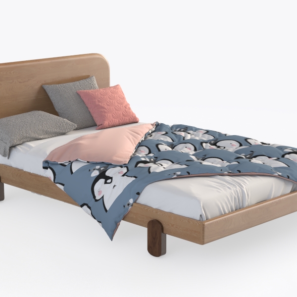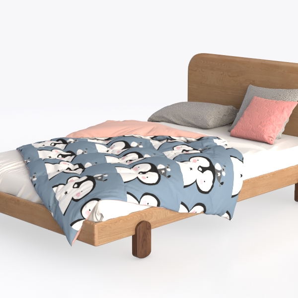Inspired by playful wildlife and cozy home vibes, this bed features a warm wooden headboard with smooth texture. A soft quilt in blue, pink, and gray, adorned with cute penguin patterns, adds a gentle, inviting touch. Ideal for a kid’s room or cozy bedroom, pairing with soft lighting and pastel decor. Sturdy wooden frame ensures stability, lightweight quilt offers warmth without bulk, enhancing bedtime comfort.