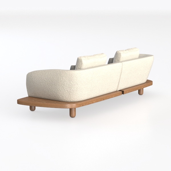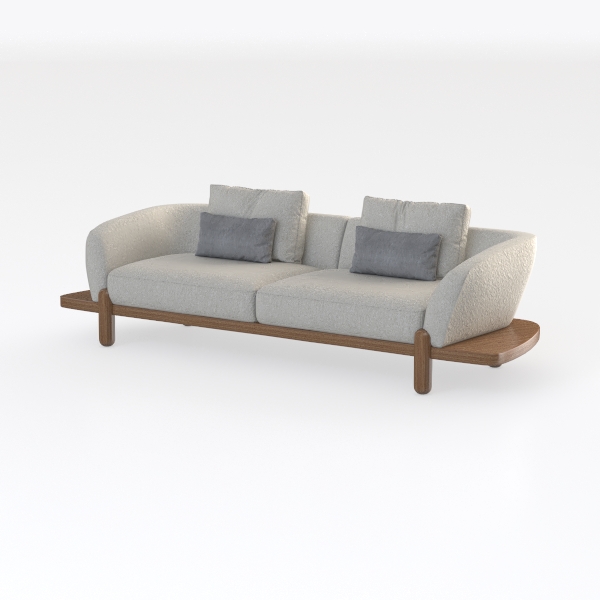 Visually, the sofa feels light yet substantial: its slim, polished oak base curves gracefully, with slender, tapering legs that lift it slightly from the floor, creating an airy, uncluttered presence. The neutral palette—ivory and soft gray—lets it blend seamlessly into diverse spaces, whether bathed in natural light or paired with bold accent pieces.