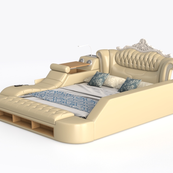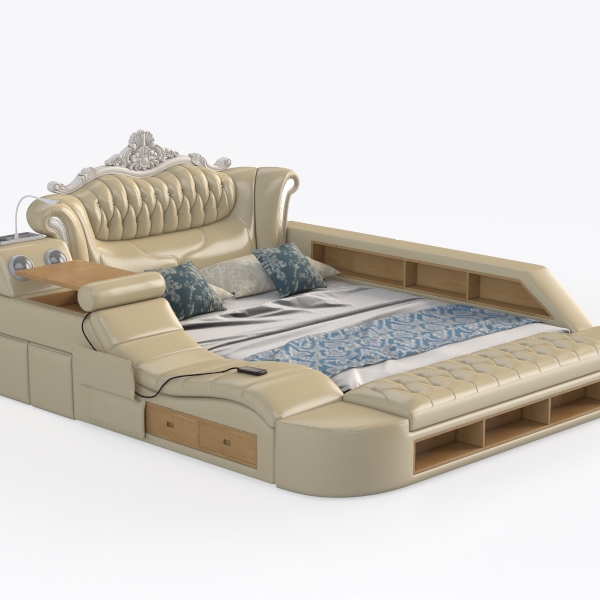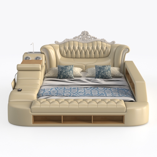 Inspired by classic European craftsmanship, this bed blends timeless elegance with modern comfort. Soft, smooth leather upholstery and intricate carved headboard details create a warm, inviting texture that feels luxurious to the touch. Perfect for a neoclassical or luxury bedroom, it pairs beautifully with marble nightstands and metallic accents, enhancing the sophisticated ambiance. Ample storage drawers beneath and a side table add practicality, making it both stylish and functional.