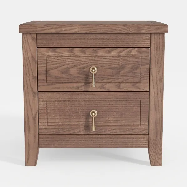 Inspired by natural wood grain and timeless Scandinavian design, this wooden nightstand features a warm, smooth texture with rich, earthy tones. Subtle brass handles add elegant accents, enhancing its inviting vibe. Ideal for modern minimalist or rustic-chic bedrooms, pair with soft linen bedding and vintage wall art. Two spacious drawers provide convenient storage, balancing functionality and understated charm.