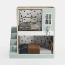 Inspired by nature, the design blends forest-themed patterns with soft, warm tones, creating a cozy and adventurous vibe. Light wood frames and mint accents add a fresh, gentle touch, while playful animal and tree motifs bring a lively, child-friendly feel. Perfect for a kid’s room, it pairs with plush toys and natural decor, enhancing a Nordic or whimsical style. Staircase with built-in drawers offers storage, and the upper guardrail ensures safety, making it practical and charming.