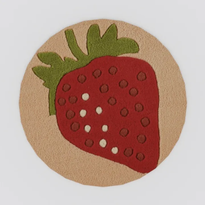 A 3D model of a strawberry-patterned carpet, featuring soft, textured materials in beige, red, and green, with cute white and brown dot details. It has a playful, decorative aesthetic and is suitable for home decor.