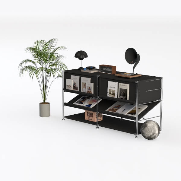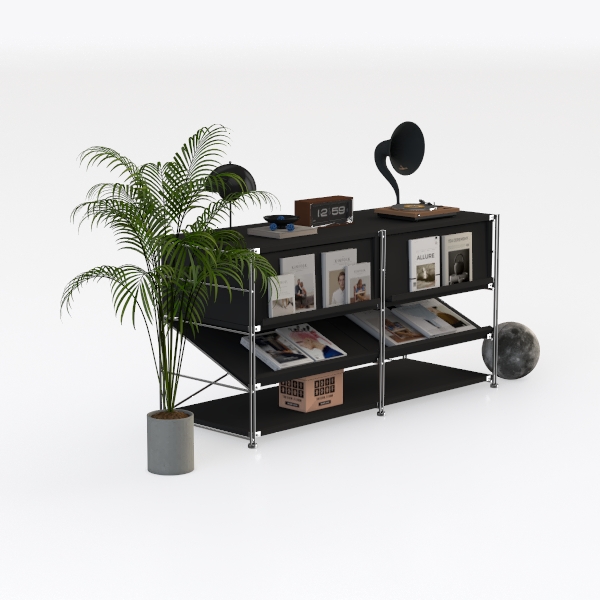 This shelving unit draws inspiration from modular design and minimalist principles, with sleek black surfaces and polished metal frames. Its clean lines and structured layout create a clutter-free yet dynamic look, ideal for a modern minimalist living room or home office. Paired with potted plants and vintage decor like a gramophone, it blends functionality—spacious tiers for books, photos, and decor—with warm, inviting style.