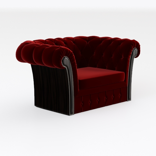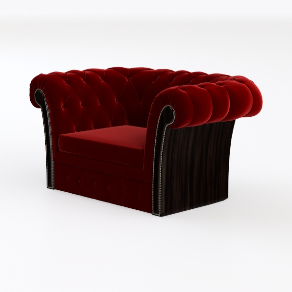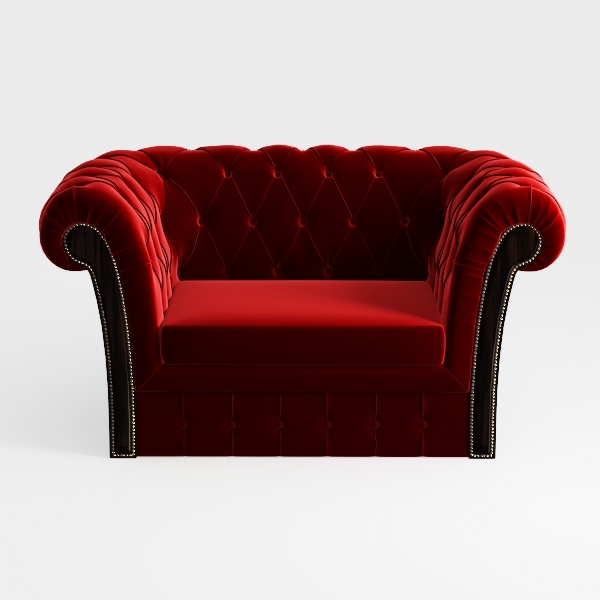 Inspired by the heritage of classic Chesterfield design, this armchair marries timeless sophistication with modern allure. Crafted from sumptuous red velvet, its surface radiates a plush, buttery softness that invites touch—each thread catching light to create a warm, inviting glow. The diamond-tufted backrest and seat add subtle, intentional texture, while the deep, rounded arms, accented with polished brass nailheads, frame the piece in striking contrast, balancing the richness of the fabric with sleek, refined detail.