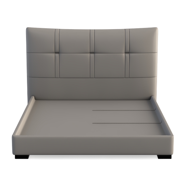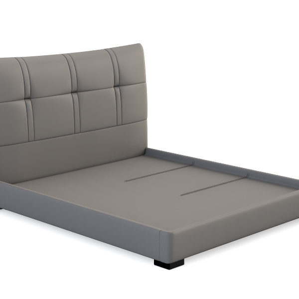 Designed with minimalist modern aesthetics, this bed features a soft, smooth upholstered headboard with structured paneling, blending sleek lines and subtle texture that feels both elegant and inviting. Its neutral gray hue adds warmth, while the sturdy frame with slatted base ensures breathability. Ideal for contemporary master bedrooms, it pairs beautifully with wooden floors and matte black fixtures, enhancing a calm, sophisticated atmosphere. The contoured headboard and flat, supportive base offer excellent support, ensuring a restful night’s sleep.