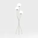 A 3D model of a Floor Lamp, featuring three white spherical glass shades and a gold-toned metal frame and a minimalist and elegant aesthetic. It has highly detailed with clean lines and is suitable for living rooms or bedrooms as ambient lighting.
