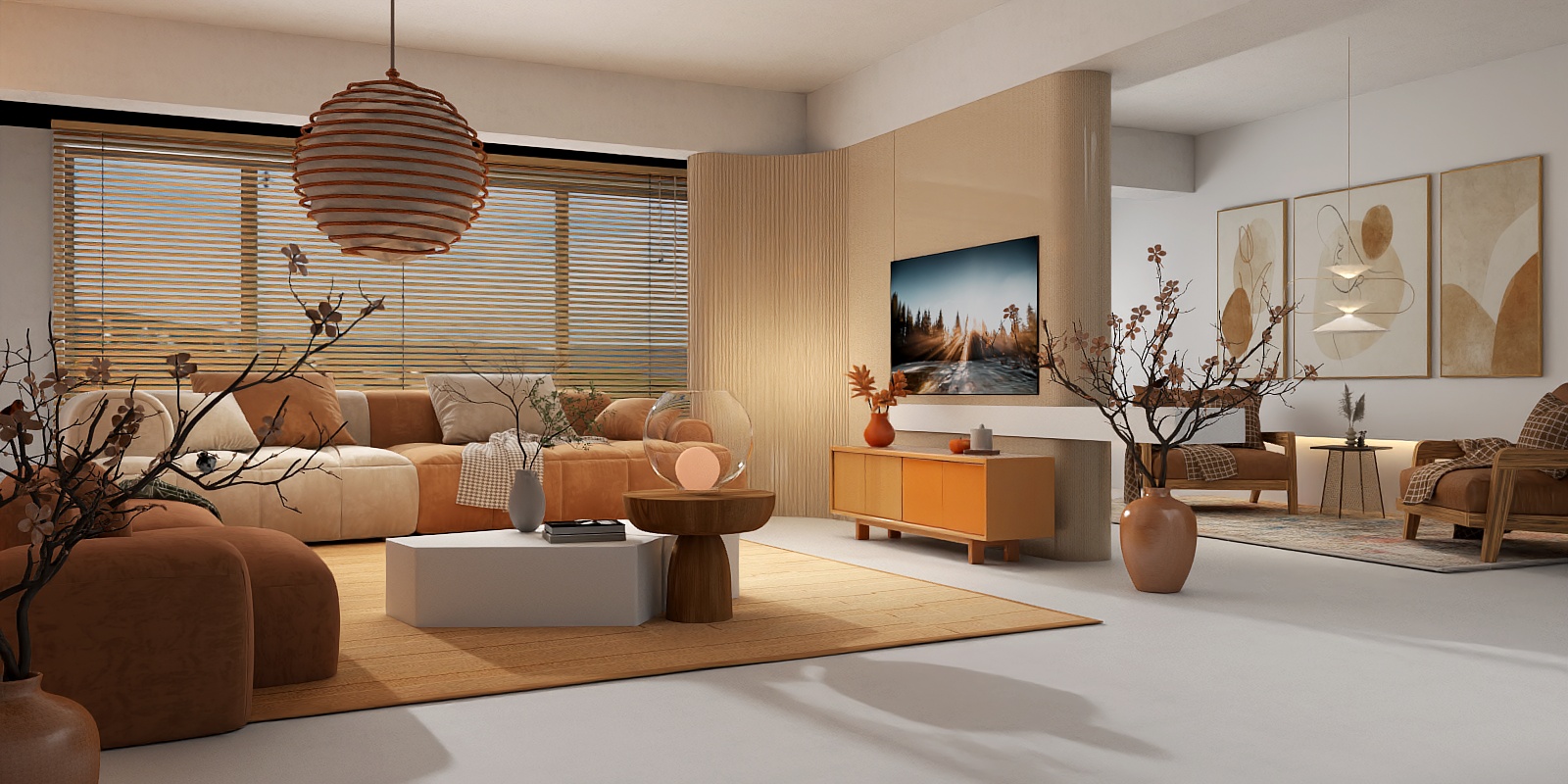 This modular sofa draws inspiration from the harmony of organic forms and adaptive living, blending soft, flowing lines with practical flexibility. Its warm terracotta hue, reminiscent of sun-baked earth, evokes a sense of comfort and groundedness, while the rounded, cloud-like silhouette softens any space it occupies. The texture is remarkably tactile—plush and slightly fuzzy, like sinking into a well-loved blanket, making it an immediate invitation to relax. Visually, the modular design feels intentional yet unforced: individual modules connect seamlessly, creating a balanced, almost sculptural piece that doesn’t overpower a room but rather complements it, whether in a minimalist, Scandinavian, or warm modern setting.
