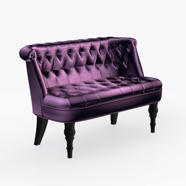 Crafted to blend vintage allure with contemporary flair, this stunning piece draws inspiration from 19th-century upholstery traditions, reimagined with a modern color palette and sleek silhouettes. The eggplant-purple upholstery shimmers softly, its smooth, buttery texture inviting gentle caresses—velvety yet firm, like a second skin that balances comfort with structure. Tufted in a symmetrical, diamond pattern, the backrest and seat create a rhythmic, sculptural texture that catches light, evoking the depth of polished amethyst, while the low, curved arms frame the design with a touch of old-world elegance.