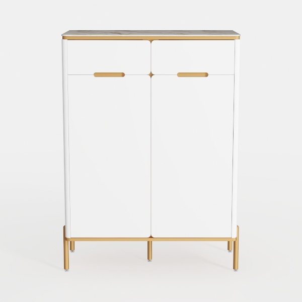 Inspired by minimalist elegance, this cabinet blends clean lines with warm metallic accents. Sleek white doors, smooth to the touch, contrast beautifully with polished gold handles and base, while the marble-like top adds subtle texture. Perfect for a modern-luxe living room or entryway, it pairs effortlessly with neutral sofas and wooden floors, offering ample storage space behind doors and sturdy gold legs ensuring stability and sophistication.