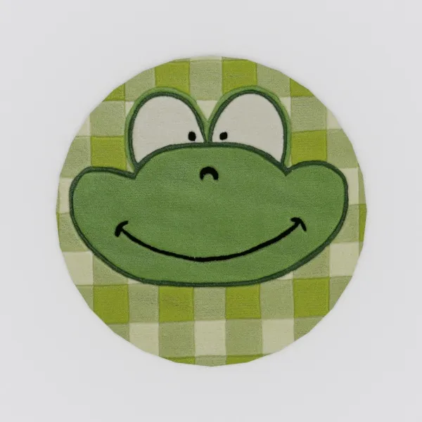 A 3D model of a cute frog-themed circular carpet, featuring a green gingham pattern and an embroidered frog face with white eyes and a black mouth. It has a soft, textured surface and a playful aesthetic, suitable for children's rooms or living spaces as decorative flooring.