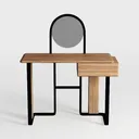 Crafted with a blend of organic warmth and architectural precision, this vanity piece draws inspiration from the harmony of natural textures and minimalist design. The main surface, carved from light oak with soft, visible grain patterns, feels smooth and inviting to the touch—warm like sunlight on wood, cool enough to rest cosmetics or skincare tools without worry. Its edges are gently rounded, softening the angularity of the black matte metal frame that forms the structure, creating a silhouette that feels both grounded and light.