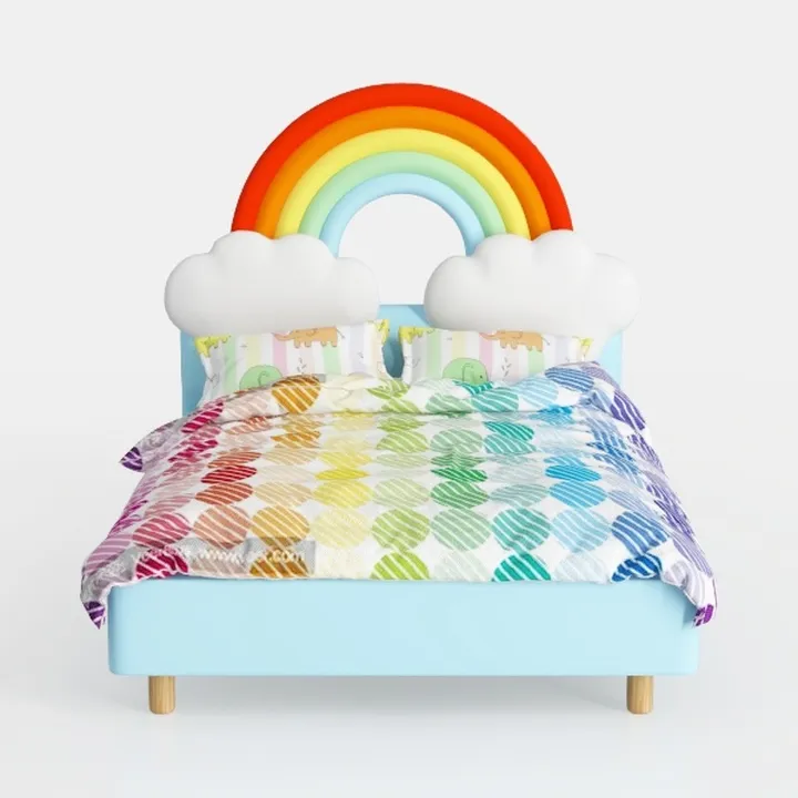 This children's bed features a playful giraffe print duvet, a checkered headboard, and 368316 polygons, ideal for a modern kid's bedroom.