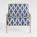 A contemporary lounge chair with navy blue geometric patterned upholstery and a metallic frame, offering 24876 polygons for living spaces.