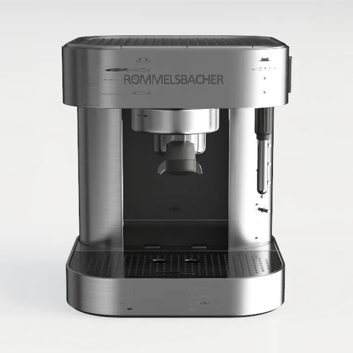 A 3D model of an espresso machine, featuring metallic and glossy surfaces with stainless steel and plastic materials, and a sleek, minimalist design. It has detailed control panel and functional brew group, suitable for home or office coffee preparation.
