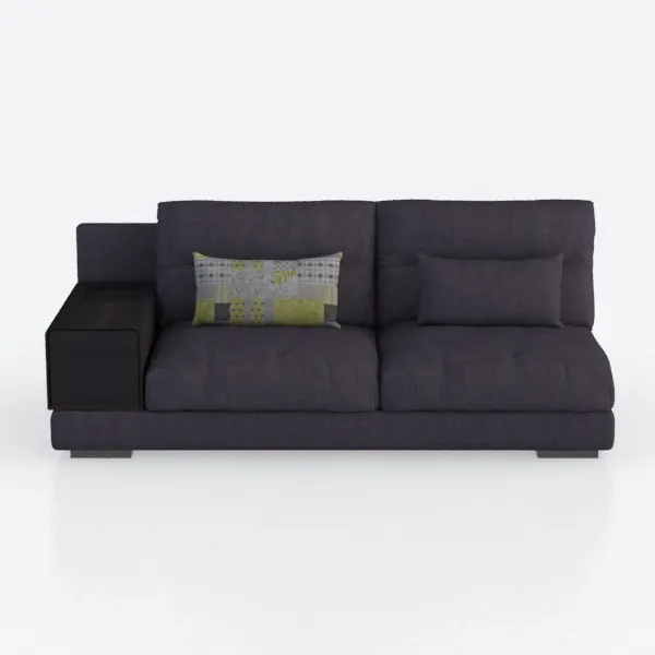 This modern sofa features a dark textured fabric upholstery, integrated side storage, and 39631 polygons, ideal for contemporary living room designs.