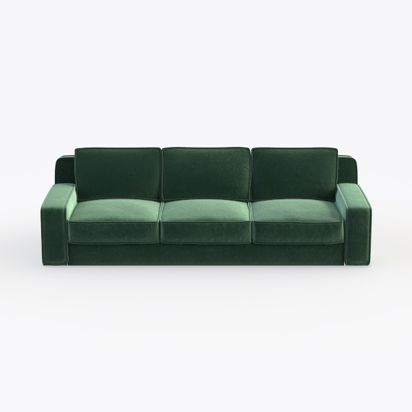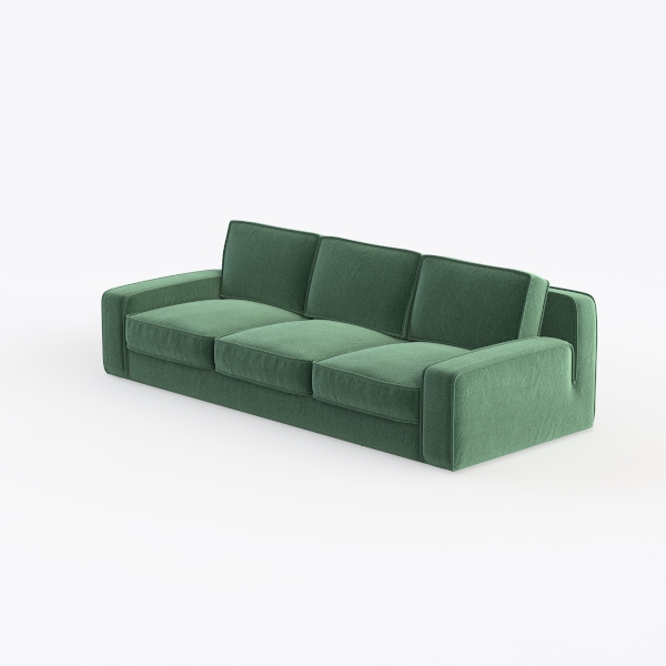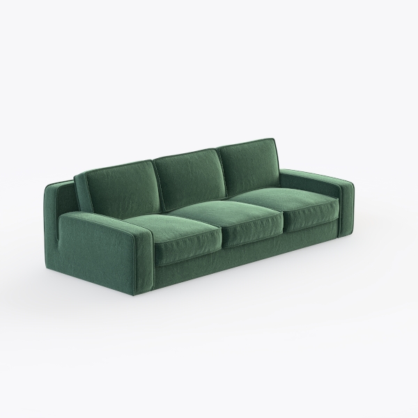 This sofa merges organic warmth with contemporary elegance, drawing inspiration from the lush, muted tones of a rainforest undergrowth. Its deep emerald green hue feels both grounding and sophisticated, while the crisp, angular lines of its frame reflect a commitment to clean, uncluttered design.
