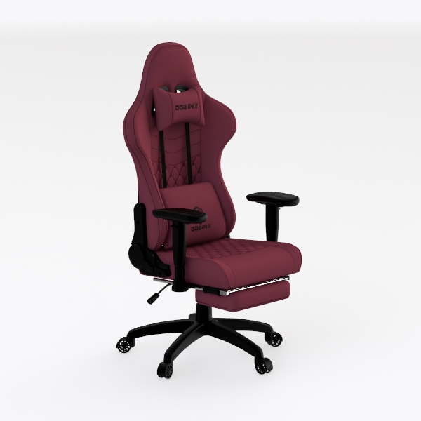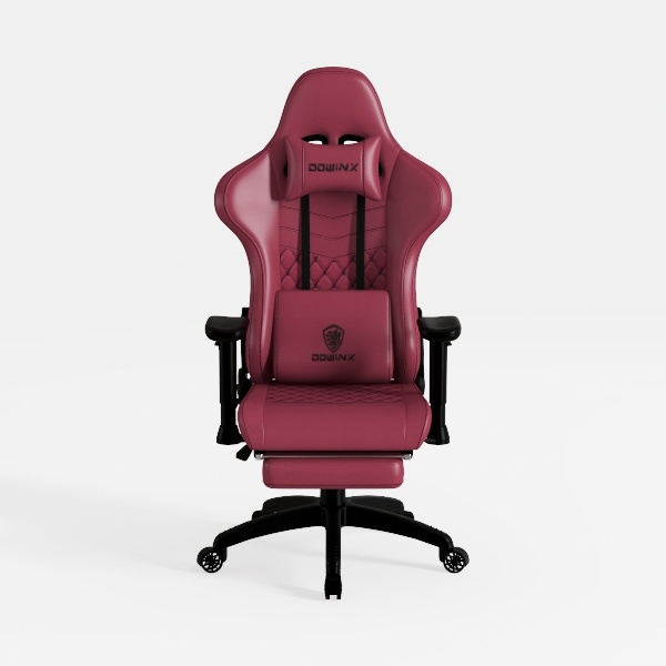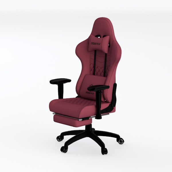 Inspired by racing seats and modern ergonomic needs, this chair features sleek wine-red leather with diamond stitching, blending sporty energy and refined style. Its black frame and armrests create a striking contrast, while the padded headrest and lumbar support offer all-day comfort. Ideal for gaming setups or home offices, it pairs seamlessly with black desks and RGB lighting, with a retractable footrest enhancing relaxation during long sessions.