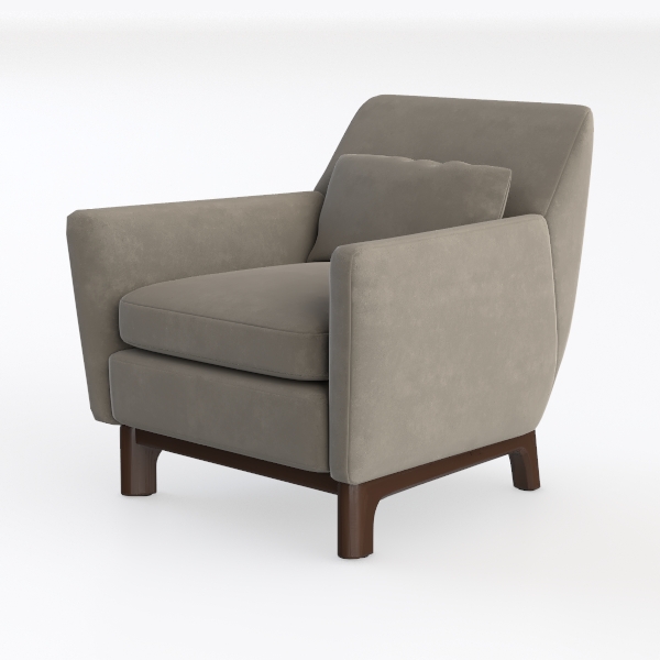 This armchair, with its understated elegance, draws inspiration from mid-century modern design—celebrating clean lines, functional simplicity, and a focus on warmth. The soft, velvety upholstery in a muted taupe gray feels surprisingly plush to the touch, inviting a gentle sink-in that balances firm support with cozy comfort. Curved armrests and a slightly contoured backrest cradle the body, while smooth, tapered edges add a subtle, organic softness to the overall silhouette.