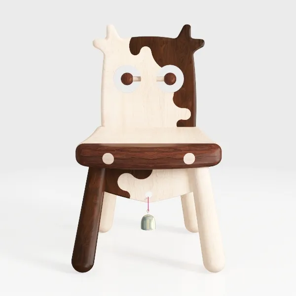 A playful chair designed with a whimsical cow motif, showcasing light and dark wood finishes and 27548 polygons, perfect for a child's room.