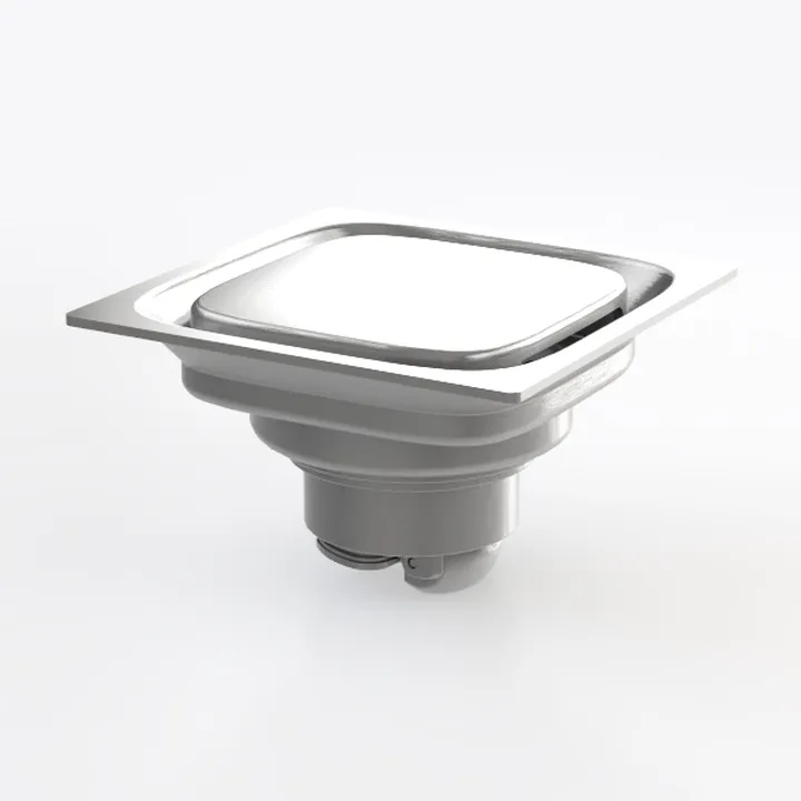 A 3D model of a Floor Drain, featuring a square top with circular drain opening and stainless steel finish, and a minimalist, functional aesthetic. It has highly detailed, low polygon count and is suitable for residential and commercial drainage applications.
