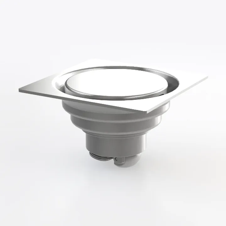 A 3D model of a Floor Drain, featuring stainless steel material, square base and circular drain outlet, with a sleek modern aesthetic. It has a detailed structure and is suitable for bathroom or kitchen drainage.