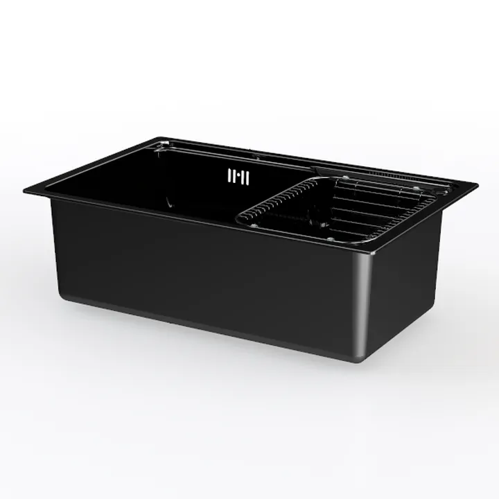 A 3D model of a kitchen sink, featuring a sleek black stainless steel finish and integrated drain grid. It has a modern minimalist aesthetic, high detail, and is suitable for kitchen or bathroom use.