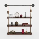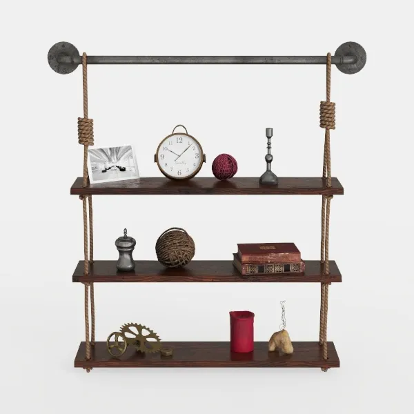 A rustic industrial shelf with dark wood planks, metal pipe, and rope suspension, designed for living rooms or offices, rendered with 148012 polygons.