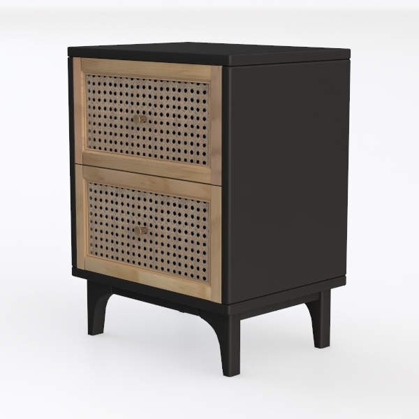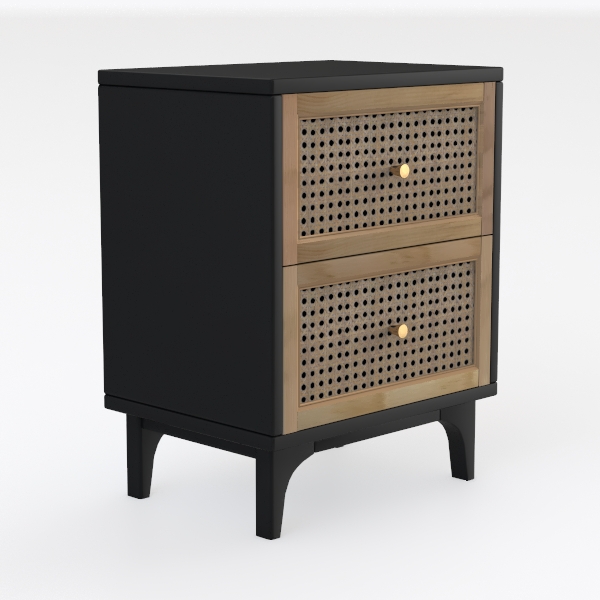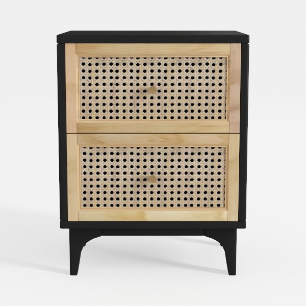 Inspired by tropical minimalism, blending organic rattan with sleek black accents, this nightstand merges nature and modernity. Textured rattan panels offer a warm, natural touch, while smooth wood and matte black frame create a balanced, airy look. Ideal for Scandi-Japanese or modern boho bedrooms, pairing beautifully with wooden floors and linen bedding. Dual drawers provide ample storage, with the woven pattern adding subtle ventilation and lightness.
