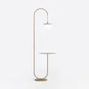 A 3D model of a Floor Lamp, featuring a brass metal frame, white glass lampshade, and a small circular shelf, with a sleek, modern minimalist aesthetic. It has low polygon count and is suitable for living rooms or bedrooms.