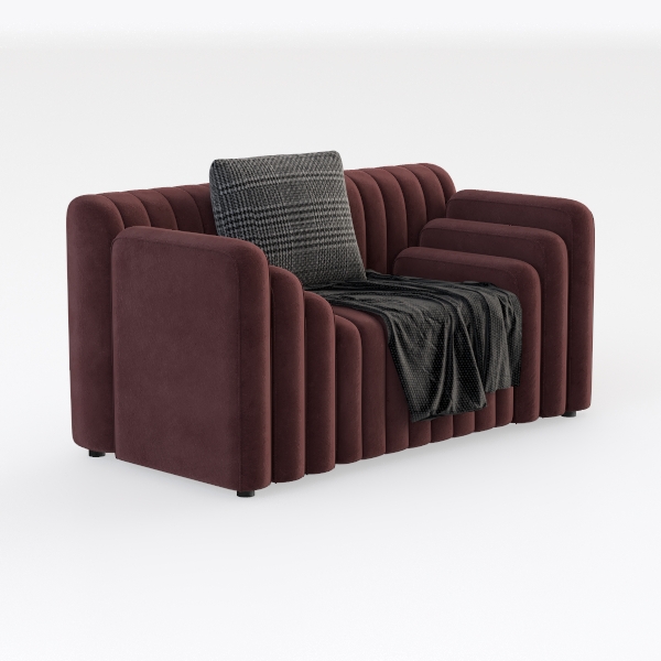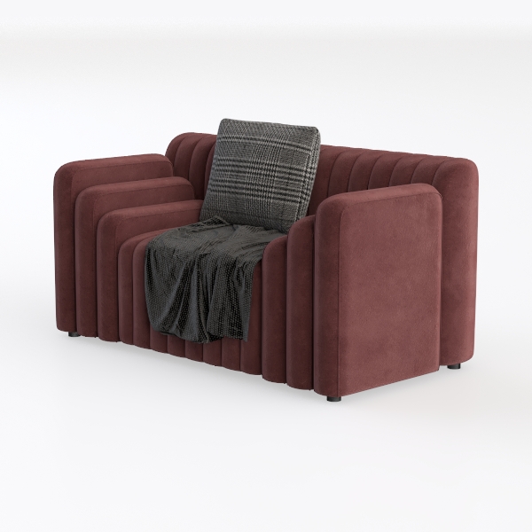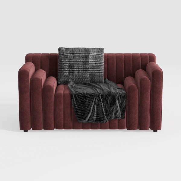 This sofa embodies a blend of timeless elegance and modern versatility, drawing inspiration from mid-century modern design principles reimagined for today’s spaces. Its soft, structured silhouette features gently undulating lines along the backrest and arms, echoing the modular charm of classic lounge furniture while feeling fresh and inviting. The rich, velvety maroon upholstery offers a warm, tactile experience—soft to the touch, with a subtle sheen that catches light beautifully, enhancing its visual depth. Textured, channeled details add dimension without clutter, creating a balanced, sculptural look, while the streamlined black legs ground the piece, balancing its lushness with a modern lightness.