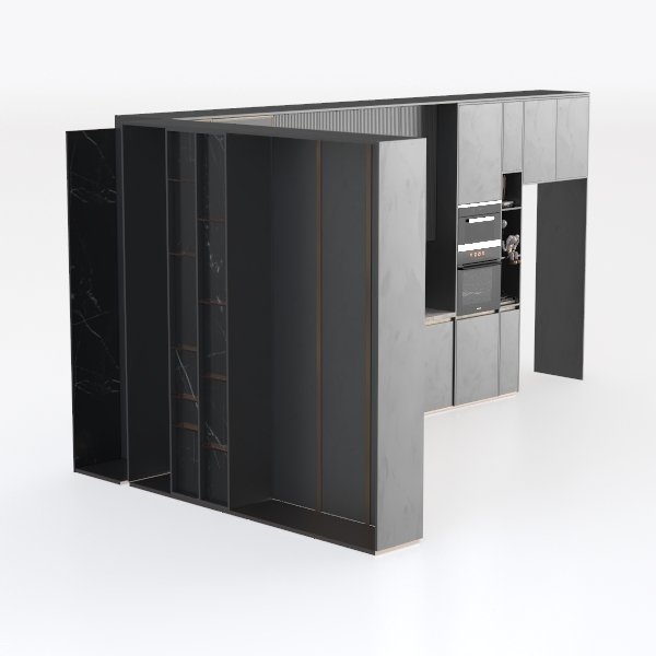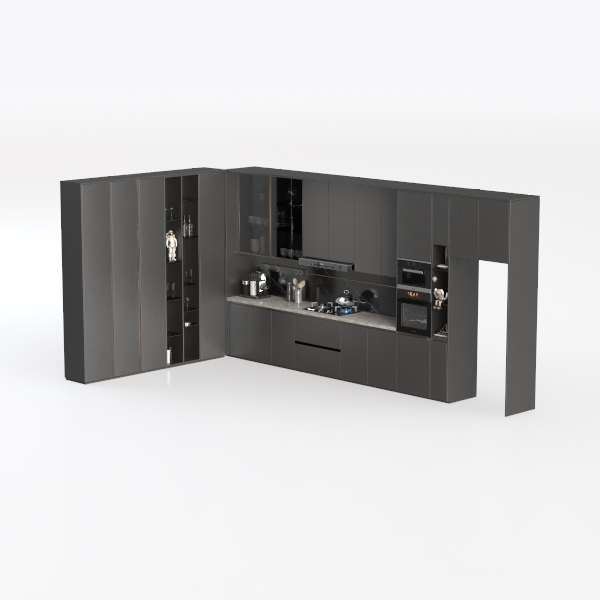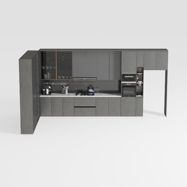 This kitchen design draws inspiration from the "less is more" ethos of modern minimalism, blending sleek aesthetics with everyday practicality. Crafted in a sophisticated cool gray palette, the cabinetry features a smooth, matte finish that catches light softly, while integrated hardware—think slim, brushed brass handles—adds subtle contrast without overwhelming the eye. The countertop, with its natural stone-like veining, blends durability with understated luxury, offering a tactile surface that feels cool to the touch yet inviting for food prep.