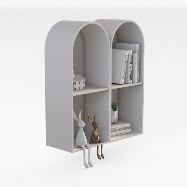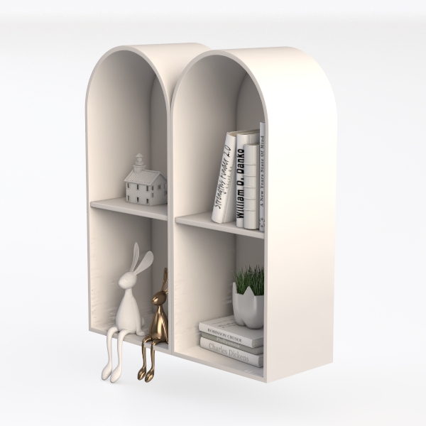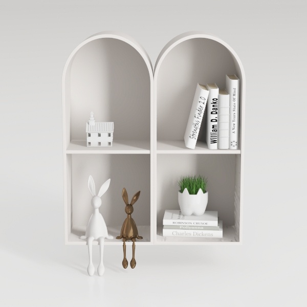 Inspired by classic architectural arches, this white, layered shelf blends whimsy with minimalism. Its smooth matte surface contrasts softly with ceramic rabbit figurines and fresh green grass, creating a cozy, inviting vibe. Perfect for a child’s room or study, it balances display space for books, decor, and warmth, enhancing any home’s charming, functional corner.
