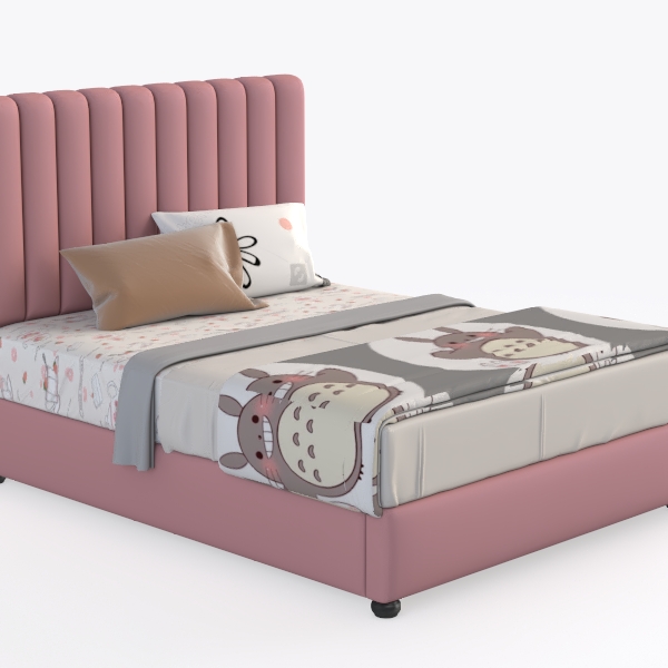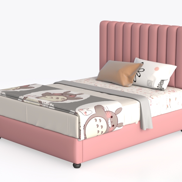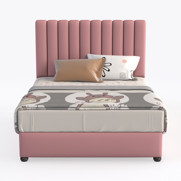 Designed to evoke playful childhood dreams, this bed features a soft pink upholstered headboard offering gentle touch. The bedspread with cute animal prints adds a lively, cheerful vibe, while the sturdy base ensures stable support. Ideal for a cozy kids' room, it pairs with pastel rugs and wooden nightstands, enhancing the warm, inviting atmosphere, and spacious under-bed storage adds practicality.