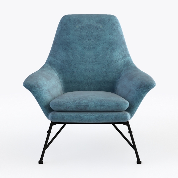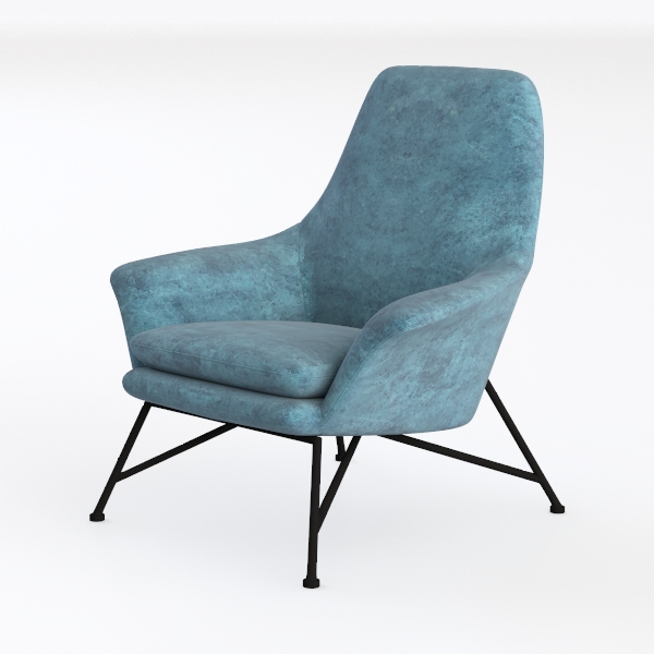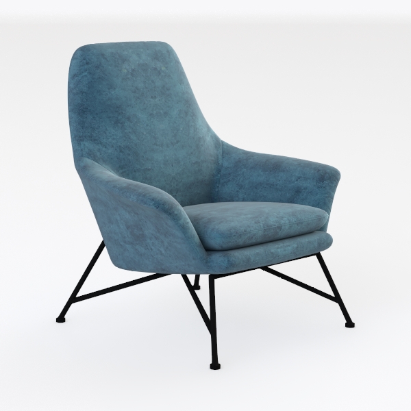 The upholstery, a muted teal-blue fabric with subtle texture, invites touch: it’s plush yet not bulky, catching light to reveal warm, earthy undertones that balance the chair’s bold shape. The black metal legs, with their angular X-frame base, add industrial edge, grounding the piece while keeping it visually light and airy.