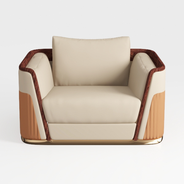 Blending modern minimalism with subtle Art Deco charm, this armchair marries clean lines with warm, inviting details, creating a piece that feels both contemporary and timeless. Its design draws inspiration from the interplay of soft curves and geometric precision—think mid-century modern elegance reimagined with a touch of luxury, balancing simplicity with intentional texture.