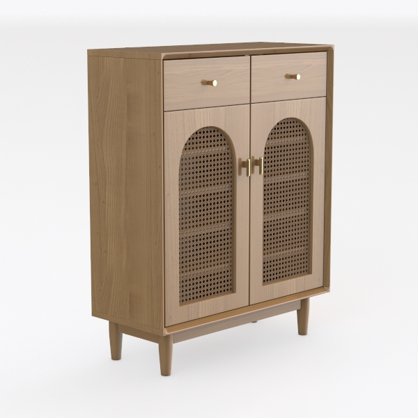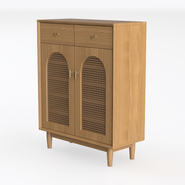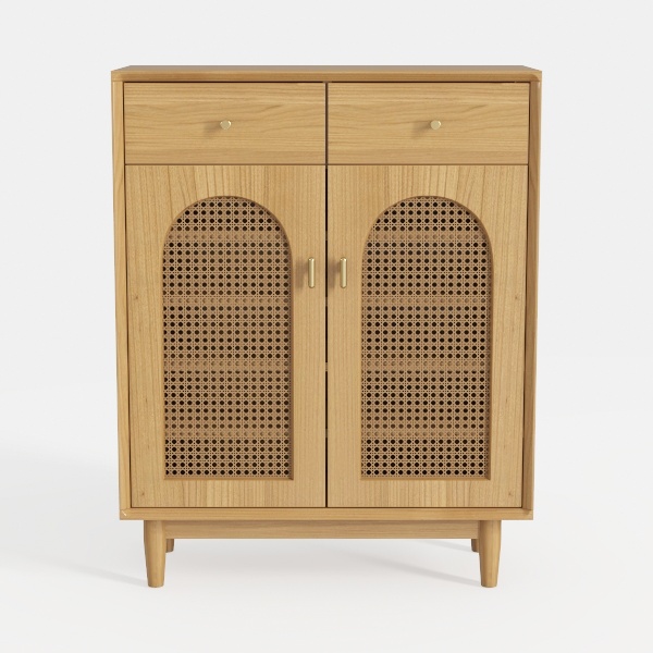 Accent Storage Cabinet Sideboard with Rattan Doors, Boho Buffet Kitchen Bar Cabinet Farmhouse Credenza Cabinet with Adjustable Shelves for Dining Room (Square Doors/Oak)