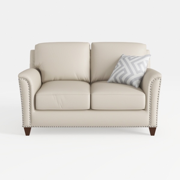 This elegant loveseat embodies a harmonious blend of mid-century modern charm and contemporary simplicity, drawing inspiration from the clean lines and timeless appeal of classic upholstery designs reimagined for today’s spaces. The soft, buttery-soft leather in a warm off-white hue creates a serene, inviting atmosphere, its smooth texture inviting gentle touches and enhancing the sense of comfort. Delicate nailhead trim along the arms and base adds subtle vintage sophistication, balancing the sofa’s minimalist silhouette with a hint of refined detail that catches the light beautifully.